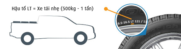 Lốp xe tải có hậu tố LT (ví dụ 9.5-16.5 LT121/117R). Đây là loại lốp dành cho những chiếc xe tải vừa và nhỏ, xe tải hàng nặng, thường có tải trọng trên 500kg đến 1 tấn. Điểm đặc biệt là cụm LT đứng giữa 2 con số, con số đứng trước chỉ chiều ngang và kích thước của vành xe (như ví dụ là 9.5 và 16.5 inch), con số đứng sau chỉ tải trọng mà xe tải hoặc đầu kéo sử dụng. Ngoài ra, lốp hậu tố LT có thể được dùng cho một số xe thể thao và Vans.