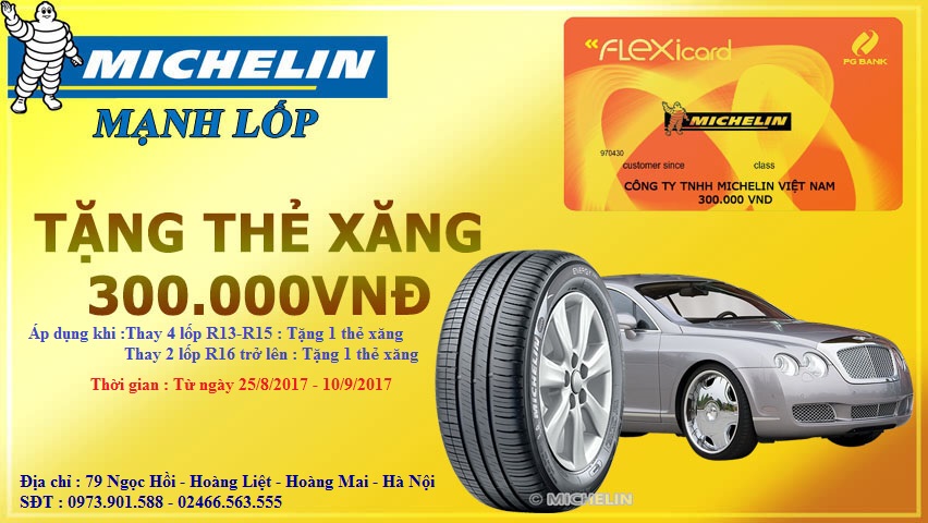 - Tặng 1 thẻ xăng đối với khách hàng thay 2 lốp Michelin từ R16 trở lên